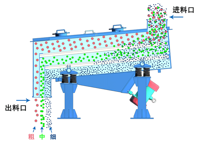 直線篩依靠兩個相同頻率的反向電機使物料在篩面上直線向前跳躍,小于篩孔孔徑的物料通過篩網(wǎng)落入下層,將原本雜亂無章的顆粒分離,即按粒度分層,形成底部小顆粒、頂部粗顆粒的排列,從而達到對物料進行篩分和分級的目的