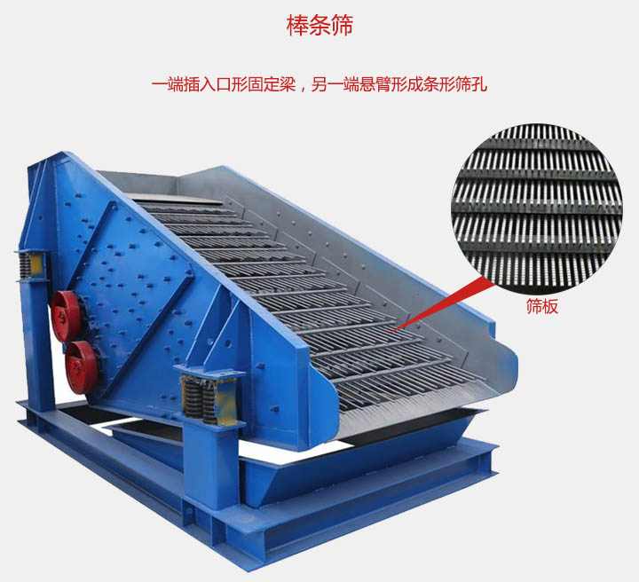 棒條篩篩面是由一組相互平行的彈簧棒條和安裝棒條的固定梁等組成的,鋼棒采用65Mn,55CrSi,60SiMn等彈簧鋼,一段插入口形固定梁,另一端懸臂形成條形篩孔,棒條的長度設(shè)計(jì)在220-360mm之間。該設(shè)備主要適用于破碎機(jī)前大塊物料的均勻給料,以及垃圾的篩分處理等行業(yè)中。