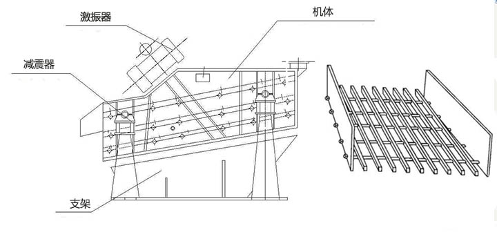 棒條篩工作時(shí),由激振器產(chǎn)生的激振力通過篩箱傳遞給篩箱內(nèi)的篩面上,因激振器產(chǎn)生激振動力為縱向力,迫使篩箱帶動篩網(wǎng)面作縱向前后位移。在一定條件下,篩網(wǎng)面上的物料因受激振力作用而被向前拋起,落下時(shí)小于篩孔的物料則透篩而落到下層,物料在篩網(wǎng)面上的運(yùn)動軌跡為拋物運(yùn)動,由于這樣周而復(fù)始的物料運(yùn)動,從而完成物料篩分作業(yè)。