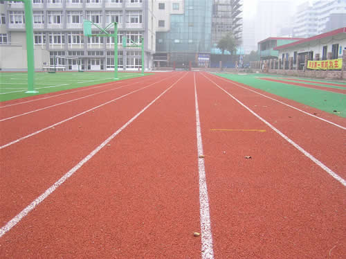 EPDM透氣型塑膠跑道, 首先需對(duì)水泥基礎(chǔ)進(jìn)行防水處理或?yàn)r青基礎(chǔ)進(jìn)行封底處理。待基礎(chǔ)層處理完畢保養(yǎng)24小時(shí)后即可攤鋪跑道底層,用3-4mm的高彈性橡膠黑色再生膠粒加入相對(duì)比例的聚氨酯粘接膠水,攪拌均勻倒入場地,刮耙刮平,鋪設(shè)厚度8mm,固化保養(yǎng)24小時(shí)。用2-3mm的EPDM跑道面層材料加聚氨酯粘接劑攪拌均勻后倒入施工場地,刮耙刮平,用鐵板或者機(jī)械壓實(shí),平整度達(dá)到國家標(biāo)準(zhǔn),特殊花紋設(shè)計(jì)、耐磨防滑,一體成型面層,厚度均勻,不掉顆粒,不鼓泡,耐老化,色彩鮮艷,在水泥基礎(chǔ)上鋪裝最佳
