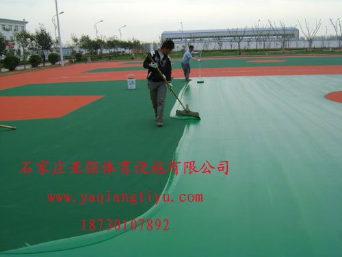 三、丙烯酸球場施工工藝:1、地面處理:依據(jù)地面狀況做好打磨、修補(bǔ)、除污、除塵。2、丙烯酸底漆:在基層均勻滾涂丙烯酸底漆。3、丙烯酸中涂層:將丙烯酸中涂全面鏝涂二道。4、丙烯酸面漆層:用丙烯酸面漆均勻滾涂地面二道。5、劃線:用丙烯酸劃線漆按標(biāo)準(zhǔn)劃線。6、地坪投入使用時間:7天后可正式投入使用。