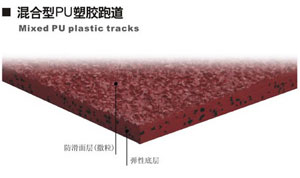 將含塑膠墊層質(zhì)量25~30%輪胎膠粒與聚氨酯(PU)塑膠攪拌混合鋪設(shè)在基礎(chǔ)上的彈性體,厚度為9mm左右,面層膠上部鋪設(shè)2~3mm厚的純(PU)膠漿,撒上EPDM防滑粒作為磨損面層,鋪設(shè)總厚度為9~13mm。具有適度的彈性,維護(hù)方便,節(jié)省管理費(fèi)用,適合于各級(jí)比賽、學(xué)校教學(xué)、訓(xùn)練等跑道場(chǎng)地。尤其適合水泥砼基礎(chǔ)、瀝青基礎(chǔ)鋪設(shè)粘結(jié)牢固、壽命長(zhǎng)。
