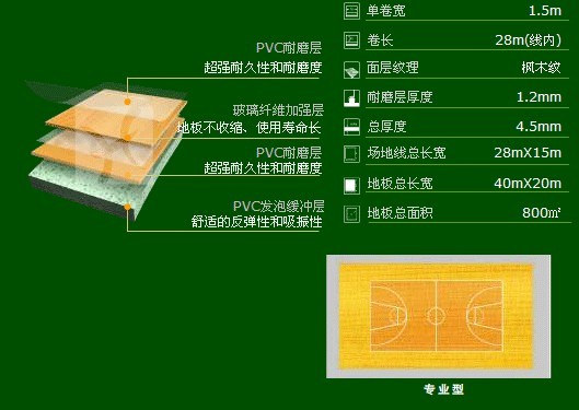 2) 籃球場專用地板100%純PVC耐磨層,厚度達1.5mm,并經(jīng)防老化和緊固技術(shù)處理,耐磨耐壓,使用壽命可達10年。