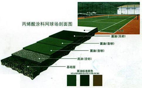 用丙烯酸彈性材料鋪裝網(wǎng)球場(chǎng)面層(可做成絨面或細(xì)顆粒狀),一般制作4mm厚,由于其特殊的物理性能和合適的彈性(現(xiàn)場(chǎng)可調(diào)),對(duì)運(yùn)動(dòng)員的腿部關(guān)節(jié)能起到很好的保護(hù)作用。適用于網(wǎng)球愛好者健身及比賽
