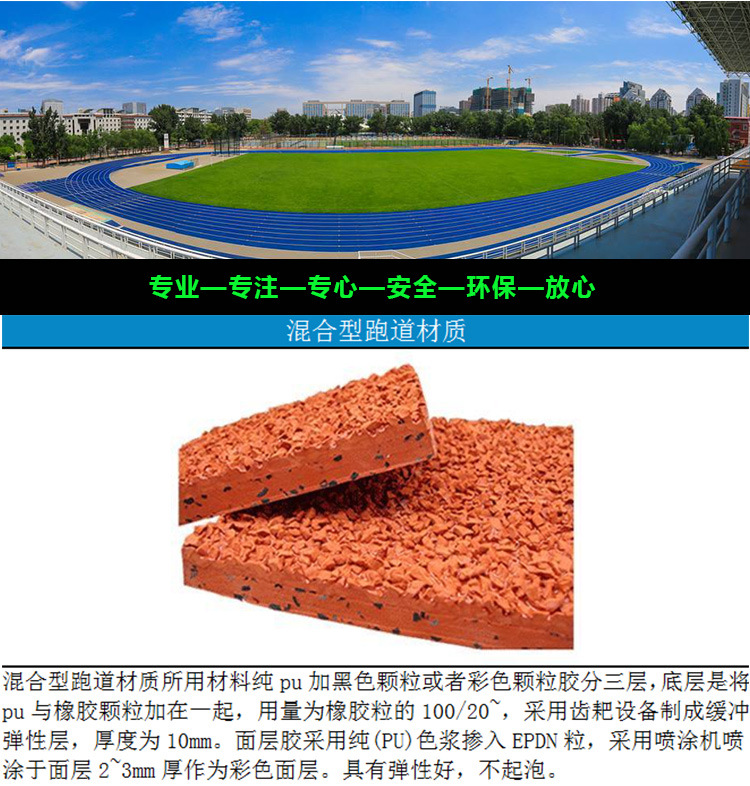 該產(chǎn)品實(shí)用性強(qiáng),日常使用無需特殊維護(hù),清潔簡(jiǎn)便,節(jié)約管理費(fèi)用?;旌闲退苣z跑道主要適用于室外田徑跑道及田徑