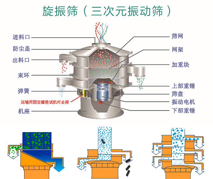 旋振篩是由電機(jī)提供振動源,從進(jìn)料口投入物料,在振動狀態(tài)下穿過篩網(wǎng)直到出料口;防塵蓋、束環(huán)是為振動篩提供封閉狀態(tài)的。